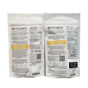 McGuire's Signature Drinking Chocolate 67%is a single origin dark chocolate that was crafted specifically to be the ideal drinking chocolate and is served at McGuire's Chocolate café in St. Andrews, New Brunswick. Heat 1 cup of water, milk or milk alternative and then add 3 tbsps (25g) of cocoa, whisking vigorously. Or, use less milk for a thicker drink.