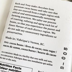 Ruth and Tony, co-founders of Turtle Mountain Chocolate, are making their chocolate in Vernon, B.C. They use only premium cacao beans sourced from a single region with ethical and environmental sustaining farming practices. Their chocolate making process is tailored for each lot of beans, so you experience the purest and finest flavour of each distinct region. No unnecessary ingredients or preservatives are added to their bars.
