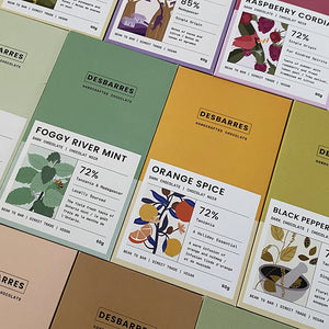 Desbarres is based in Uxbridge, Ontario and co-founded by Ariane and Erik Hansen. They relaunched their bars in early 2024 with bright new packaging and a change in size from 38g to a 60g bar. All their cacao beans are direct trade and single origin, all bars are made bean to bar and for the unflavoured bars they contain only 2 ingredients - cocoa nibs and organic cane sugar. Bars with additions are made with locally sourced ingredients.
