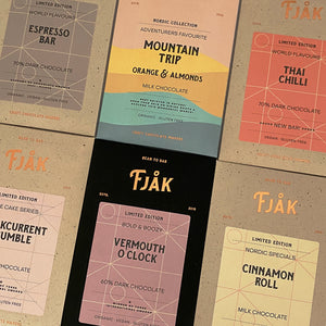 " Our signature Nordic Collection gives our best handcrafted Single Origin chocolate, a unique Nordic Twist. Flavoured chocolate inspired by wild Norwegian nature, celebrating Nordic food culture and local traditions. FJAK Limited Edition bars are handcrafted in smaller batches, where we experiment with different cacao, play with ne flavours and techniques, or include seasonal ingredients to create some truly unique chocolate bars." - FJAK
