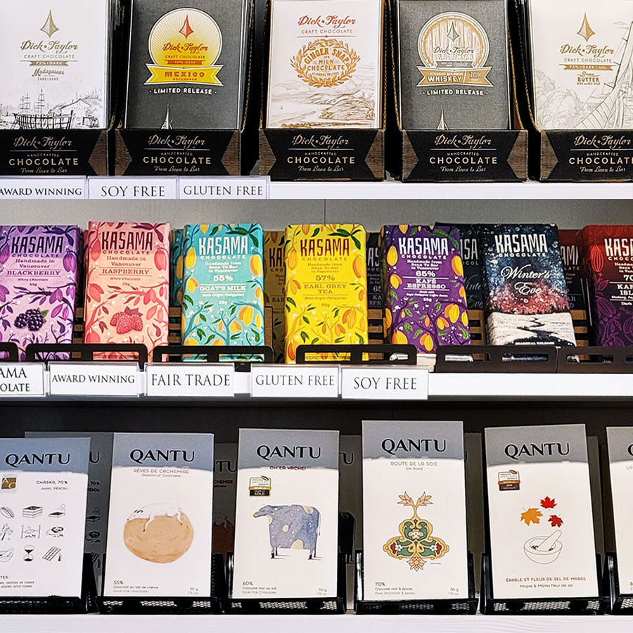 My appreciation for fine chocolate has changed over the years and while I still enjoy chocolate confections, my true love now is craft chocolate with simple ingredients. We have filled our shelves with a curated assortment of fine flavour bean to bar chocolate. When you visit our store we will happily tell you all about each one. Because behind every one of these bars has a story worth sharing. The chocolate maker and their approach, the origin and inherent flavours of the beans and how each bar came to be are the things we like to talk about.