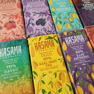 A second special release bar by Kasama! For this one, they used cocoa beans from Papua New Guinea with a unique aroma profile, and aged them for 4 weeks in an oak cask with Odd Society's Wallflower Gin. After the aging process was finished, they stone ground the beans with juniper berries. While this chocolate melts on your tongue and the aroma and flavours unfold you will enjoy an elegant floral bouquet with aromas of fresh cut evergreens and hints of orange blossom. 55g bar